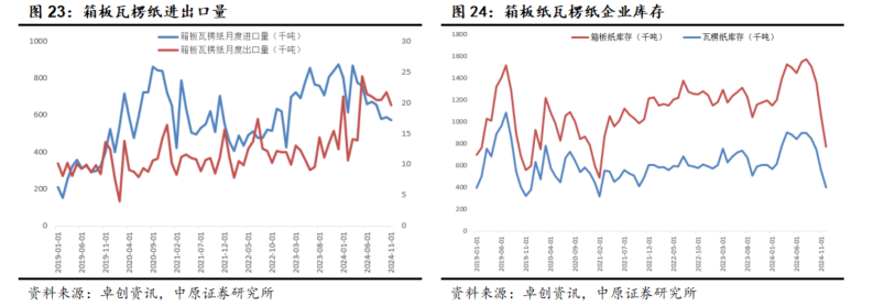 从进出口来看,进口量同比继续下滑,出口量同比持续增长。2024年11月箱板纸和瓦楞纸分别进口42.37、14.83万吨,合计进口57.20万吨,同比下降31.85%;分别出口1.47、0.49万吨,合计出口1.96万吨,同比增长26.21%。