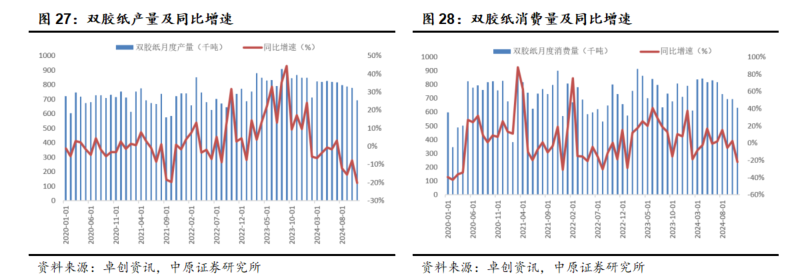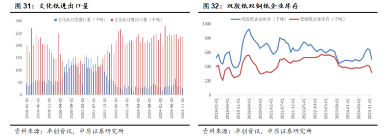 从库存来看,库存环比均有下降,为连续第二个月下降,根据卓创资讯,双胶纸方面,月内出版招标订单有相对集中提货动作,纸厂挺价态度坚决,部分渠道商月内有补库动作,个别产线延续检修状态,月内持续消耗库存;双铜纸方面,部分刚需类订单有相对集中提货情况,个别产线检修过程中库存有所去化,此外纸价有所上涨,部分渠道商适当补库,均利好于纸厂去库。2024年12月,双胶纸、双铜纸企业库存分别为50.55、31.50万吨,同比分别+3.09%、-19.64%,环比分别-20.61%、-21.84%。