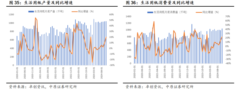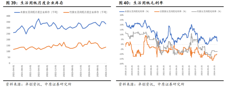 从库存来看,木浆生活用纸库存环比下降、竹浆生活用纸库存上升,根据卓创资讯,由于新增产能释放,日化产能增大,导致木浆生活用纸纸企库存天数呈现微幅下降。2024年12月,木浆、竹浆生活用纸月度企业库存分别为33.3、13.7万吨,同比分别+0.30%、-19.88%,环比分别-4.86%、+4.58%。