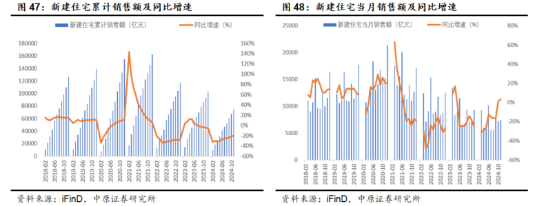 新建住宅当月销售面积增速由负转正,有较为明显的好转,累计销售面积降幅连续第七个月收窄,受宏观政策持续放松作用,2024年11月份新建商品房销售情况进一步改善,销售面积持续好转。2024年11月全国新建住宅销售面积6856万平方米,同比增长4.22%,增速由负转正;1-11月全国新建住宅累计销售面积72224万平方米,同比下降16%,降幅连续第七个月收窄,较2024年10月收窄1.7pct。