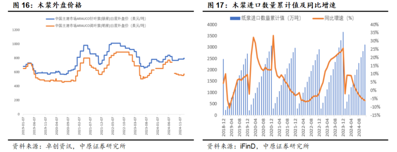 2024年12月31日,针叶浆(银星)外盘报价为795美元/吨,较上月末+10美元/吨,阔叶浆(明星)外盘报价为570美元/吨,较上月末+20美元/吨。2024年1-11月,进口纸浆累计值为3111万吨,同比下降6.04%,进口量延续负增长并有持续扩大趋势。
