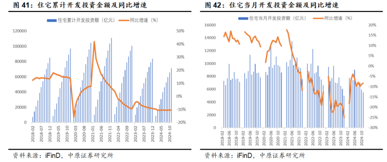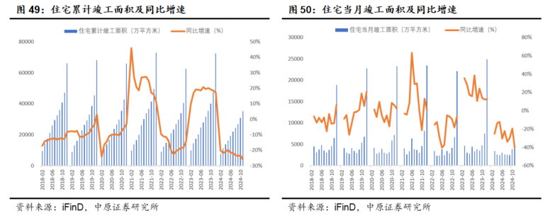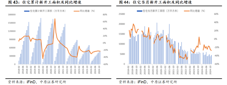 住宅累计、当月新开工面积仍为负增长且环比扩大,土地成交规模持续下降拖累新开工规模。2024年11月全国住宅新开工面积4421万平方米,同比下降27.27%,降幅环比扩大;1-11月全国住宅累计新开工面积48989万平方米,同比下降23.10%,降幅略有扩大。