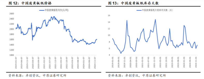 废黄板纸价格继续上涨,供应整体偏少,下游纸厂消费量持续上升,市场呈现供弱需强。2024年12月31日,废黄板纸均价为1600元/吨,较上月末上升1.46%,月内价格继续上涨;2024年12月,废黄板纸库存天数为7天,环比+1天,库存略有上升。