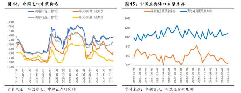 中国进口木浆价格涨势各异,但在月底均呈现拉涨,其中,针叶浆高位运行,阔叶浆先跌后涨,下旬快速拉涨,本色浆持续上涨,化机浆偏弱运行;外盘针叶浆、阔叶浆价格同样在月底拉涨明显,阔叶浆一转下跌势头。2024年12月31日,针叶浆、阔叶浆、本色浆及化机浆价格分别为6363、4665、5767、3683元/吨,分别较上月末+1.83%、+4.43%、+1.91%、+0.23%,据卓创资讯数据,2024年12月,中国主要地区及港口月度纸浆库存量169.35万吨,较上月上升2.12%,库存略有上升。