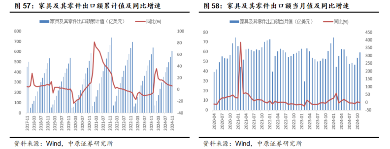 家具出口累计金额增速继续收敛,出口景气度有所回落。2024年11月家具及零件出口金额59.29亿美元,同比下降2.6%,增速由正转负;1-11月家具及零件出口金额累计608.59亿美元,同比增长6.2%,增速继续收敛。