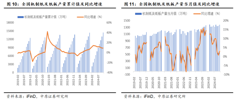 2024年11月全国机制纸及纸板产量1376.6万吨,同比增长3%,增速回升;1-11月产量14418.07万吨,同比增长9.1%,增速略降。