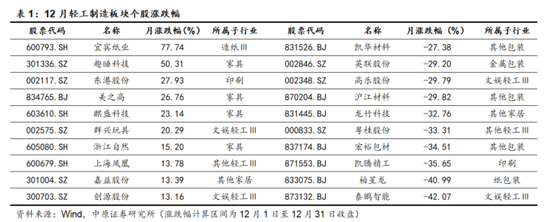 市场回顾:2024年12月轻工制造板块下跌10.28%,跑输沪深300指数6.51pct,涨幅在中信一级行业中排名第23名。本月个股跌多涨少,涨幅靠前的5名分别是宜宾纸业、趣睡科技、东港股份、美之高、麒盛科技。