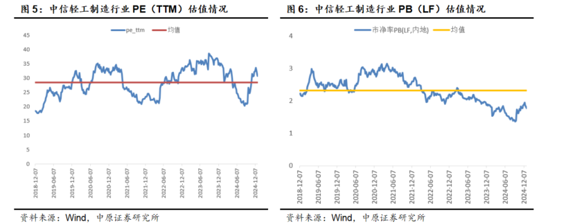 截至2024年12月31日,板块的PE(TTM)为30.84倍,处于近十年43.19%分位,在30个中信一级行业中排在第14位;PB(LF)为1.77倍,处于近十年6.87%分位。细分子板块造纸、家居、包装印刷、文娱轻工、其他轻工的PE(TTM)分别为31.72/23.36/40.85/46.32/32.37倍,分别处于历史69.59%、26.76%、86.94%、46.80%、18.09%分位,其中家居、其他轻工估值仍处于历史偏低水平。