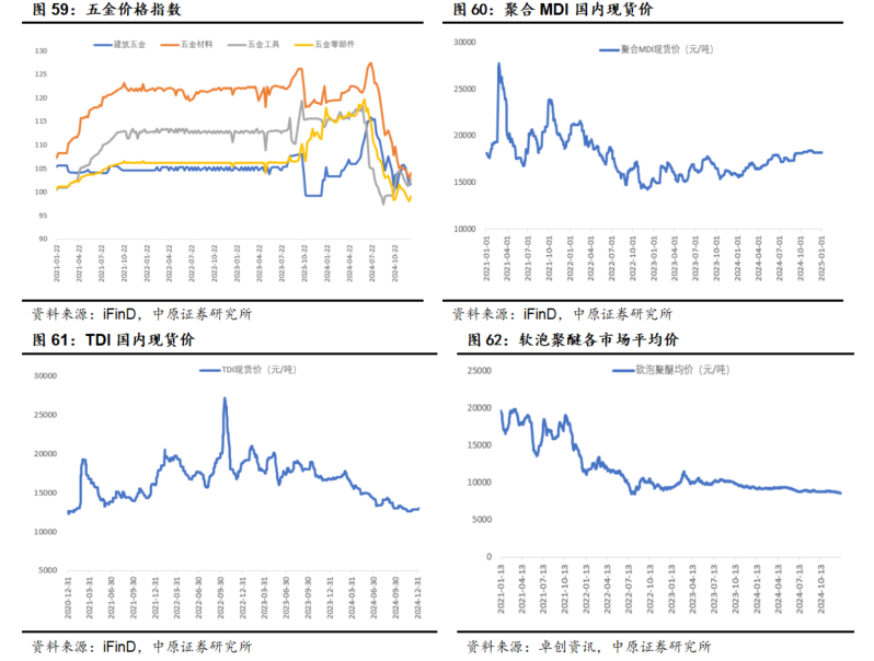 截至2024年12月31日,聚合MDI国内现货价为18183元/吨,较上月末+0.18%;TDI国内现货价为12850元/吨,较上月末+1.58%。