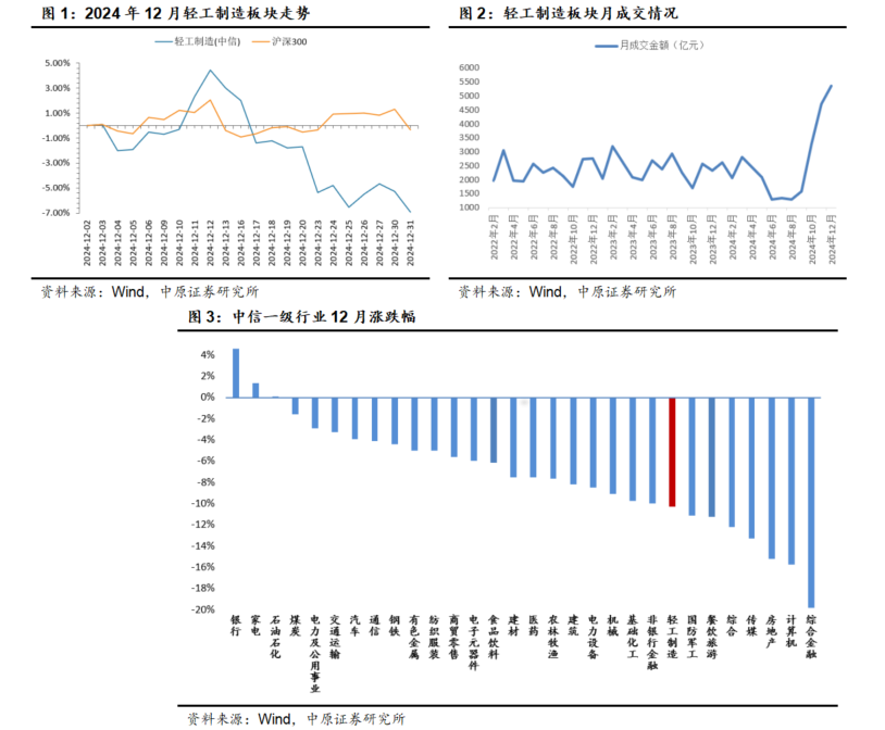 2024年12月,上证指数下跌3.59%,沪深300指数下跌3.77%,中信轻工制造行业指数下跌10.28%,跑输同期沪深300指数6.51pct,在中信30个一级行业中排名第23名,涨幅排名靠后。轻工制造板块12月成交额5349.05亿元,环比继续放量,日均成交额243.14亿元,环比提升8.22%。