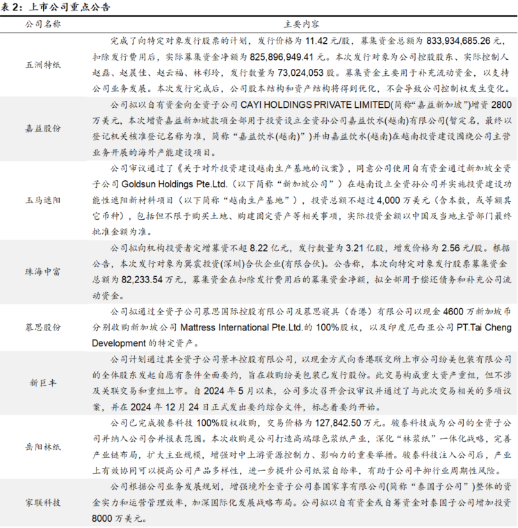 造纸:规模以上造纸企业收入、利润持续增长但增速放缓,产量增长但增速下降;废黄板纸价格继续上涨,针叶浆高位运行,阔叶浆先跌后涨,下旬快速拉涨扭转下跌势头;包装纸规模纸厂多次涨价,中小纸厂跟涨,终端消费回暖,价格持续上涨;文化纸刚需订单提货,部分产线停机检修,价格上涨;国家发布2025年加力扩围实施大规模设备更新和消费品以旧换新政策的通知,提出继续支持家装消费品以旧换新,对手机、平板、智能手表手环等3类数码产品进行购新补贴,包装用纸需求有望得到提振。建议关注林浆纸一体化头部企业太阳纸业、特种纸企业仙鹤股份、华旺科技以及卫生用纸企业百亚股份。