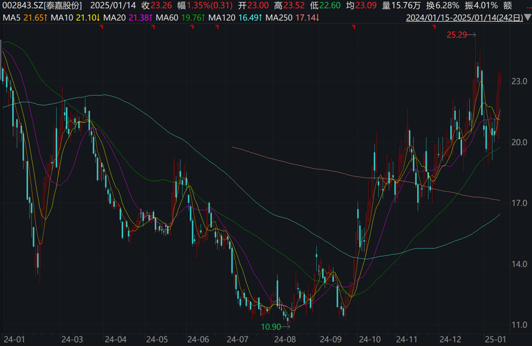 面对严峻的业绩形势,泰嘉股份的股价则呈现出与业绩截然相反的走势。在A股市场整体回暖的大背景下,该公司股价扭转了上半年的下行趋势,从同年8月13日低位10.90元/股(按前复权计算,下同)一路涨至20元/股以上,至2024年12月26日触及25.29元/股的阶段性高点,几乎逼近年初以及前两年的高位水平。