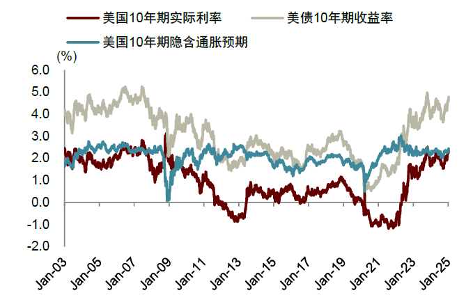 图表4:2024年美联储开启降息之后,美国十年期实际利率水平显著上升(截至2025年1月14日)