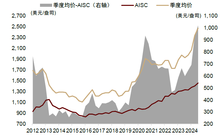 1Q24-3Q24,伦敦金季度均价从2069美元/盎司涨至2475美元/盎司,与此同时,随着全球通胀水平有所回落,全球黄金行业平均AISC的涨幅也有所放缓,从1377美元/盎司上行至1456美元/盎司,涨幅达79美元/盎司,这导致单盎司税前利润从692美元上升至1019美元,实现了327美元/盎司的上升。