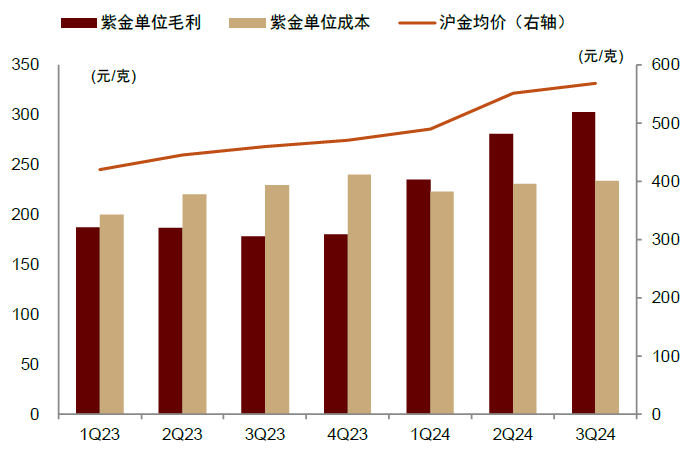 成本控制成效渐显,黄金矿企克金毛利有望走阔。根据世界黄金协会数据,全球金企平均单盎司税前利润在2020-2023年大幅下降,1Q24以来已逐步回升。3Q20-4Q23,在全球通胀高企的背景下,全球金企AISC涨幅超越金价涨幅,单盎司税前利润下降31%。1Q24-3Q24随着成本涨幅放缓和金价进一步上行,单盎司税前利润开始企稳回升,从692美元升至1019美元。展望4Q24以及2025年,我们预计全球黄金公司单盎司税前利润或进一步走阔。同时,国内2024年国内金企克金毛利已现反转回升迹象。以紫金矿业为例,克金毛利自1Q24迎来反转拐点。1Q24克金毛利235元/克,较4Q23回升55元/克,3Q24达303元/克,环比持续回升。
