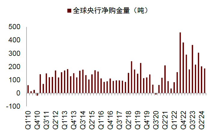 继2022年全球央行购金创出历史新高之后,2023-2024年,全球央行购金趋势仍在延续。根据世界黄金协会统计,2022年、2023年全球央行净购金量分别为1081.9吨和1049.1吨,连续两年处于历史高位,2024年前三季度全球央行累计净购金693.5吨,虽然同比下降21.6%,但与2022年同期基本持平,依然维持较高位置。