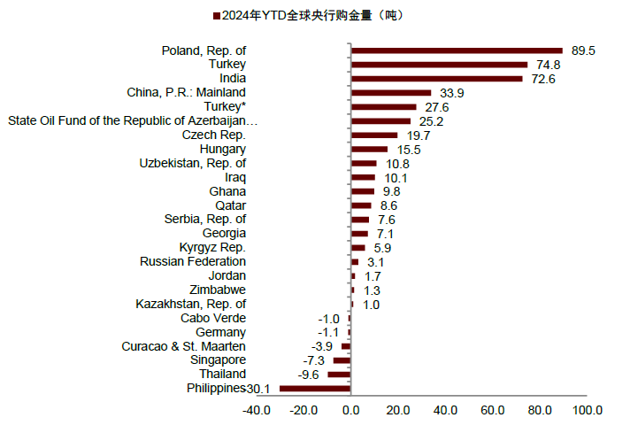 图表6:2024年初至今全球央行购金情况一览(截至2024年三季度)
