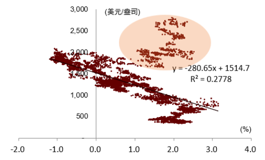 注:本散点图的样本时间范围是2003年初到2022年2月23日俄乌冲突之前。横轴为美国十年期实际利率,纵轴为伦敦金价。