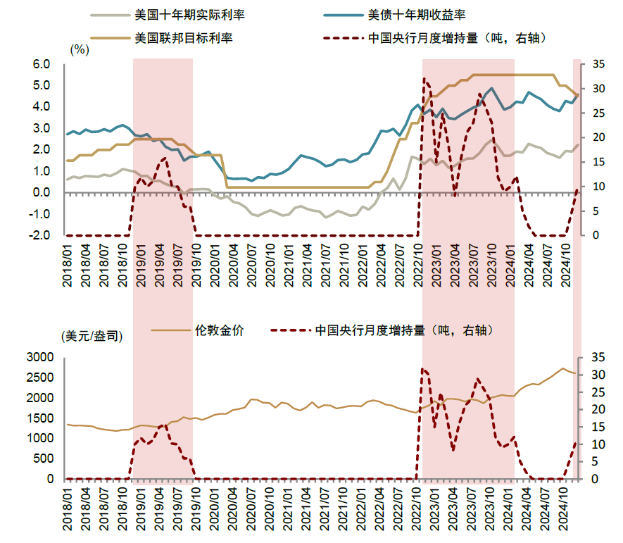 考虑到2024年底以来,美国经济韧性强于预期,再通胀趋势显现,美联储的预期管理也逐步转为鹰派,降息预期显著下降,美债利率大幅上行至4.8%,我们认为中国央行自去年11月、12月重新加码增持黄金,有望复刻2019-2022年、2022-2024年的逆周期增持黄金的成功操作,并对强势美元、美联储转鹰背景下的金价上行提供有力支撑。