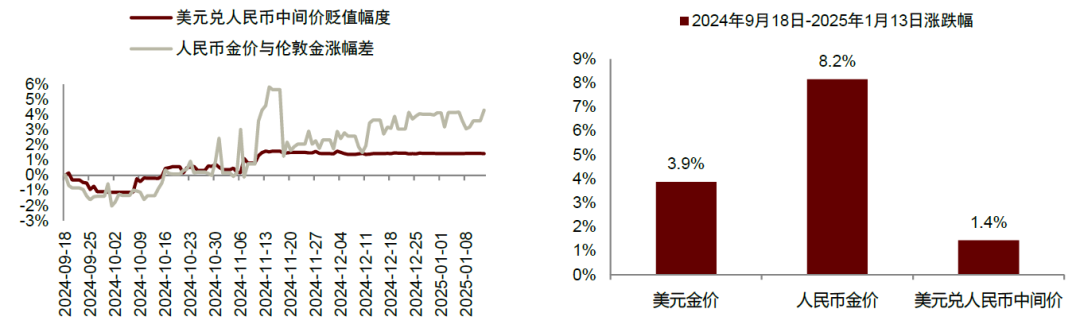 图表16:2024年9月18日美联储降息以来,人民币金价与美元金价的涨幅差异显著超越人民币中间价贬值幅度