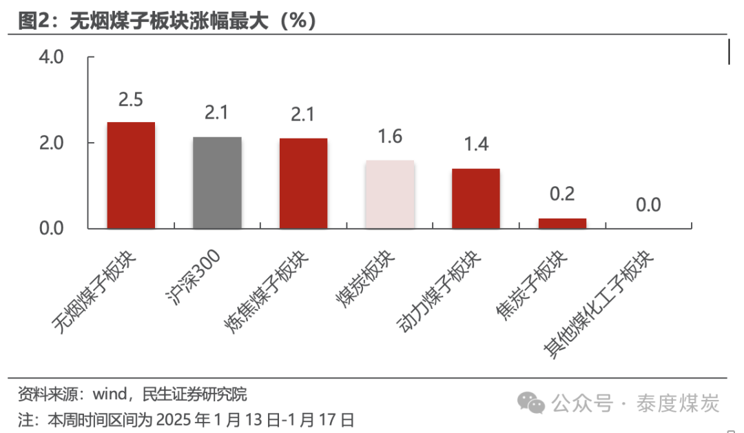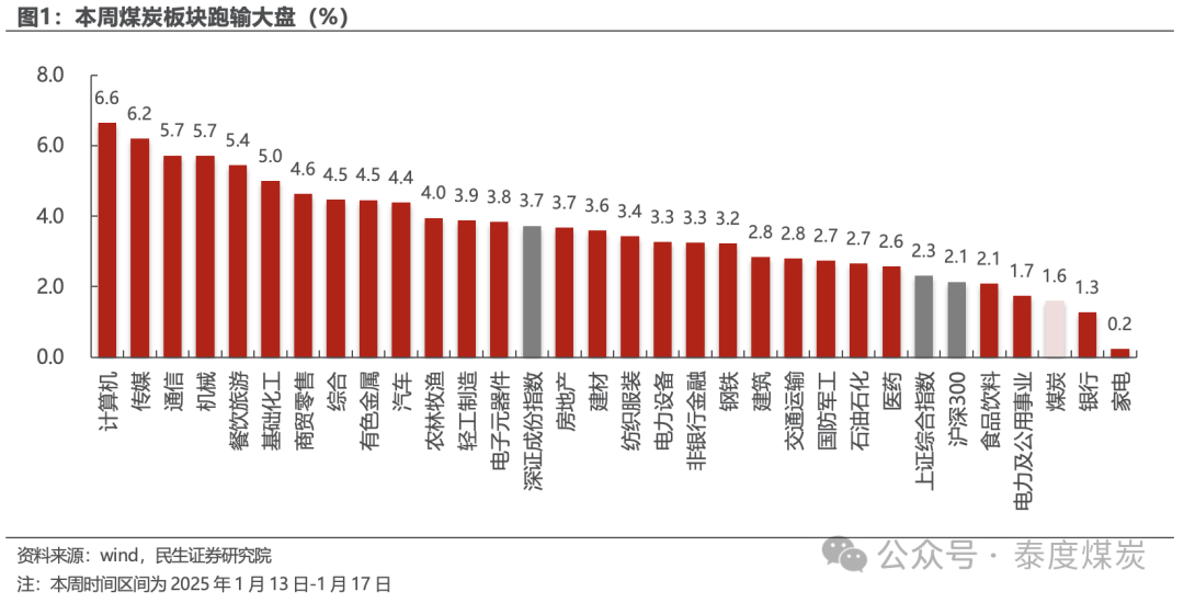 截至1月17日,本周中信煤炭板块周涨幅1.6%,同期沪深300周涨幅2.1%,上证指数周涨幅2.3%,深证成指周跌幅3.7%。