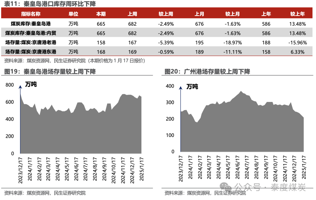 煤炭资源网数据显示,库存方面,秦皇岛港本期库存665万吨,较上周下降2.49%;广州港本期库存210万吨,较上周下降5.74%。