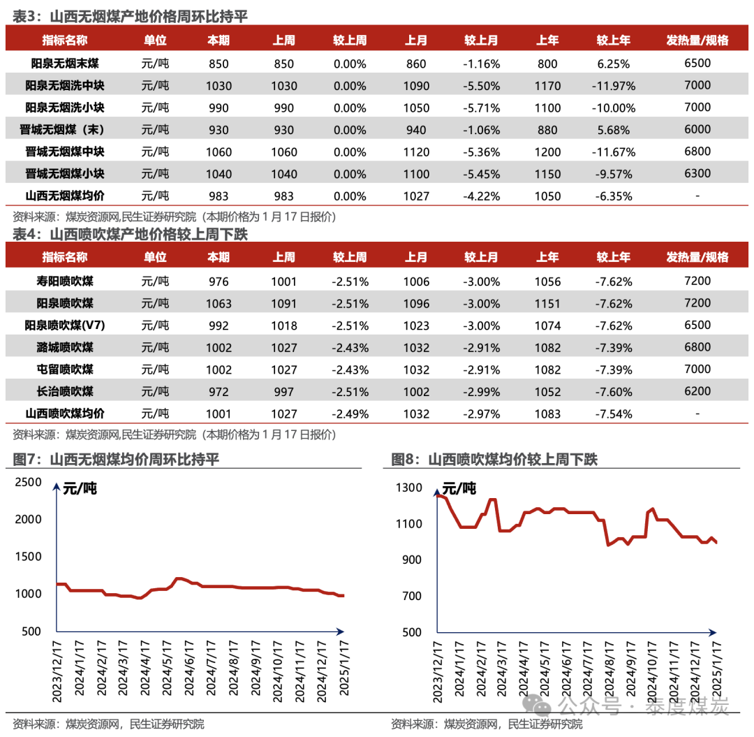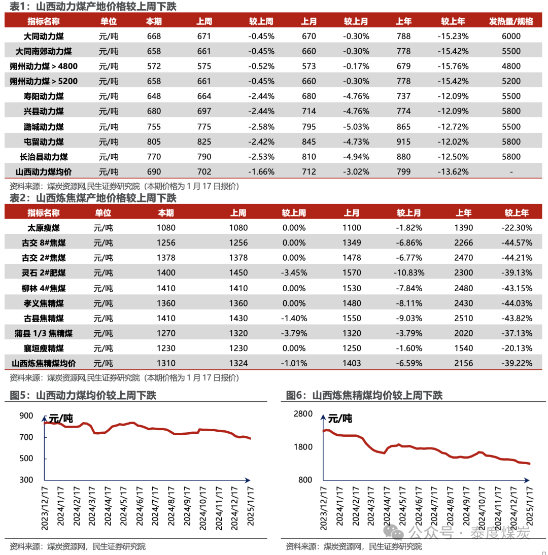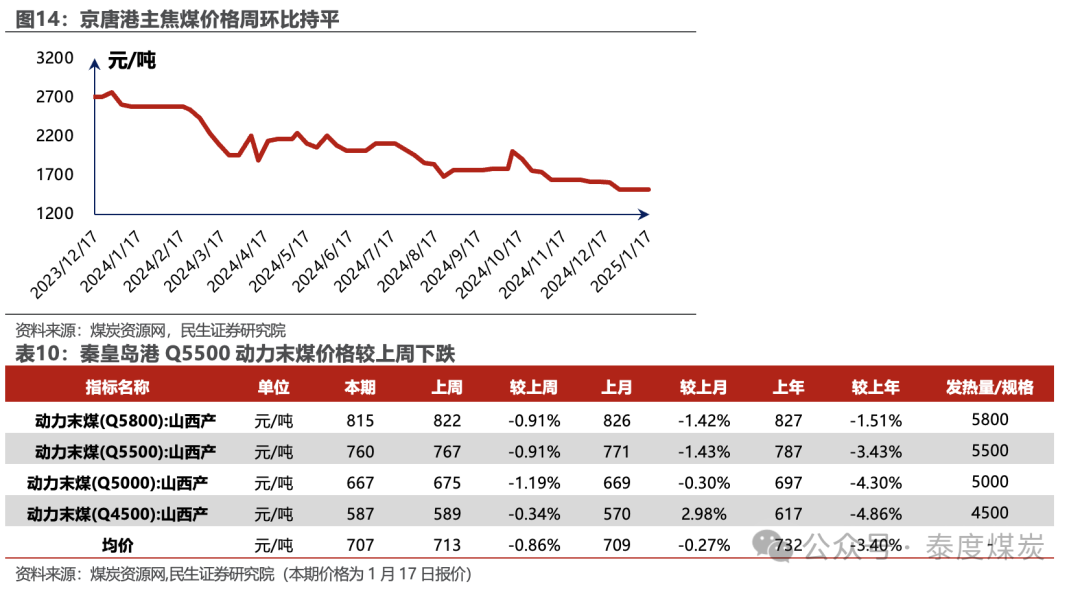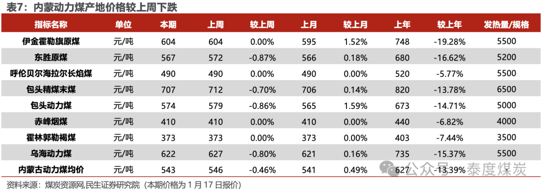 港口煤价小幅下滑,产地煤价涨跌互现。煤炭资源网数据显示,截至1月17日,秦皇岛港Q5500动力煤市场价报收于760元/吨,周环比下跌7元/吨。产地方面,据煤炭资源网数据,山西大同地区Q5500报收于628元/吨,周环比下跌3元/吨;陕西榆林地区Q5800指数报收于653元/吨,周环比上涨1元/吨;内蒙古鄂尔多斯Q5500报收于572元/吨,周环比下跌5元/吨。