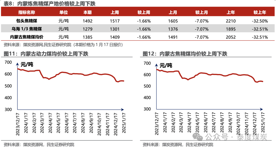 据煤炭资源网,内蒙动力煤均价本周报收543元/吨,较上周下跌0.46%。内蒙炼焦精煤均价本周报收1385元/吨,较上周下跌1.66%。