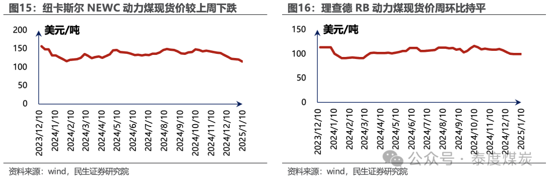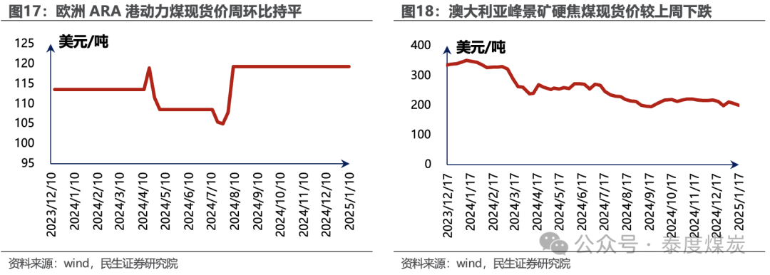 据Wind数据,1月10日,纽卡斯尔NEWC动力煤报收115.51美元/吨,较上周下跌4.51%;理查德RB动力煤均价报收100.13美元/吨,周环比持平;欧洲ARA港动力煤均价报收119.25美元/吨,周环比持平。1月17日,澳大利亚峰景矿硬焦煤现货价报收200美元/吨,较上周下跌3.38%。