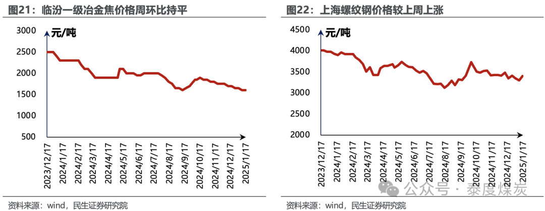 焦炭价格暂稳。据Wind数据,截至1月17日,唐山二级冶金焦市场价报收于1500元/吨,周环比持平;临汾二级冶金焦报收于1335元/吨,周环比持平。港口方面,1月17日天津港一级冶金焦价格为1730元/吨,周环比持平。