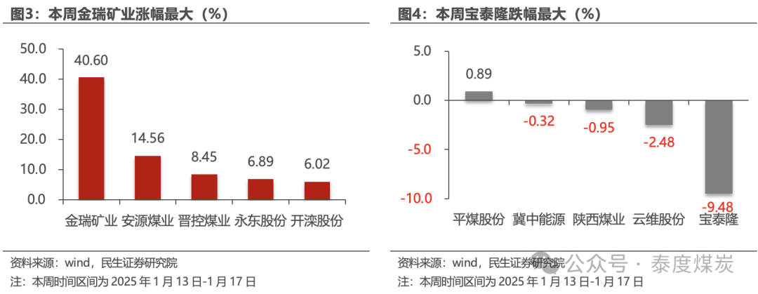 本周金瑞矿业涨幅最大。截至1月17日,煤炭行业中,公司周涨跌幅前5位分别为:金瑞矿业上涨40.60%,安源煤业上涨14.56%,晋控煤业上涨8.45%,永东股份上涨6.89%,开滦股份上涨6.02%。