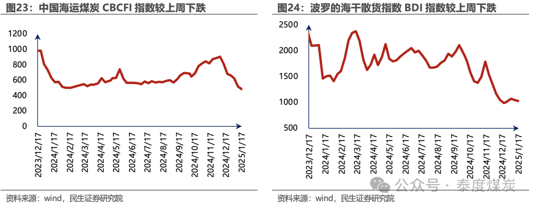 据Wind数据,截至1月17日,煤炭运价指数为485,较上周下跌6.22%;截至1月17日,BDI指数为987,较上周下跌5.82%。