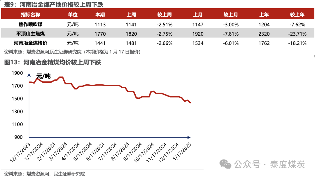 港口焦煤价格暂稳,产地煤价下滑。据煤炭资源网数据,截至1月17日,京唐港主焦煤价格为1520元/吨,周环比持平。截至1月16日,澳洲峰景矿硬焦煤现货指数为199.85美元/吨,周环比下跌7.05美元/吨。产地方面,山西低硫周环比下跌12元/吨,灵石肥煤周环比下跌50元/吨,长治喷吹煤周环比下跌25元/吨,山西高硫、济宁气煤、柳林低硫周环比持平。