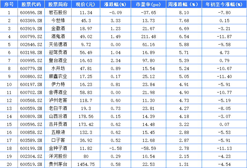 另外,唯一白酒H股珍酒李渡,报收6.56港元,滚动市盈率13.58,本周涨幅为2.66%。