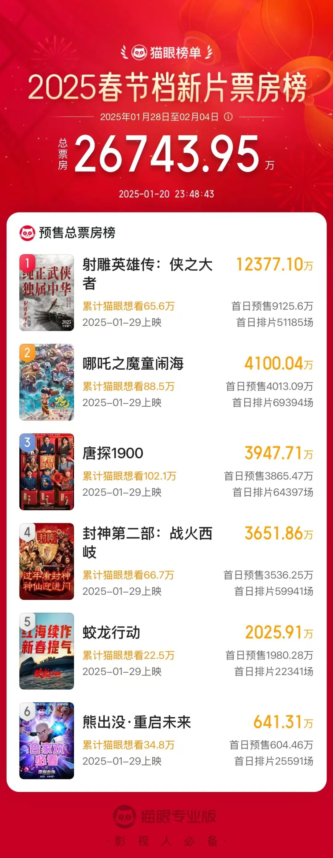 截至记者发稿,《射雕英雄传:侠之大者》《哪吒之魔童闹海》《唐探1900》分别以1.24亿元、4100.04万元以及3947.71万元的预售票房位列前三。