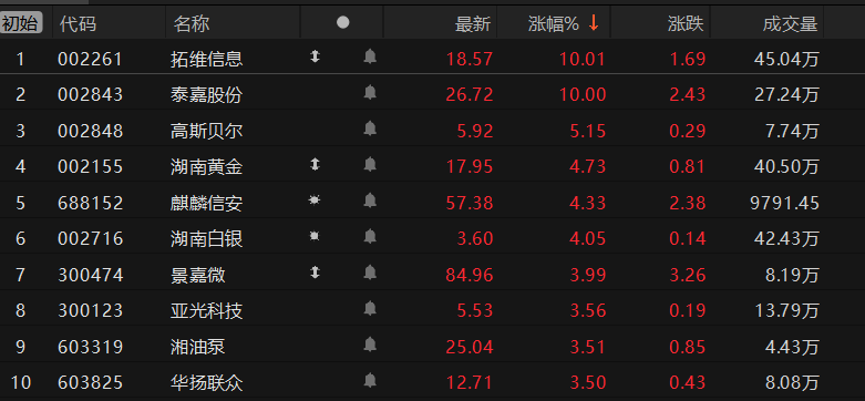 红网时刻新闻2月5日讯(记者 郭雅倩)A股湘企蛇年首个交易日行情如何?截至记者发稿,湖南A股上市公司板块整体上涨0.7%,拓维信息、泰嘉股份涨停,贵金属板块公司湖南黄金、湖南白银大涨超4%,麒麟信安、景嘉微涨幅居前,湖南146家上市公司中99家上涨。
