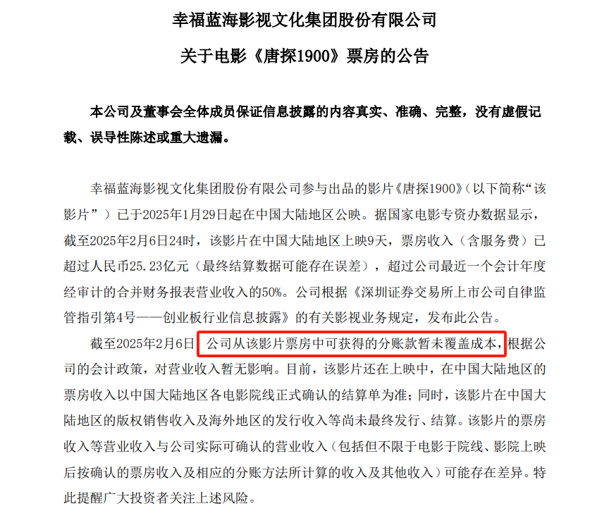 2月7日,幸福蓝海发布公告称,据国家电影专资办数据显示,截至2025年2月6日24时,《唐探1900》在中国大陆地区上映9天,票房收入(含服务费)已超过25.23亿元(最终结算数据可能存在误差),超过公司最近一个会计年度经审计的合并财务报表营业收入的50%。