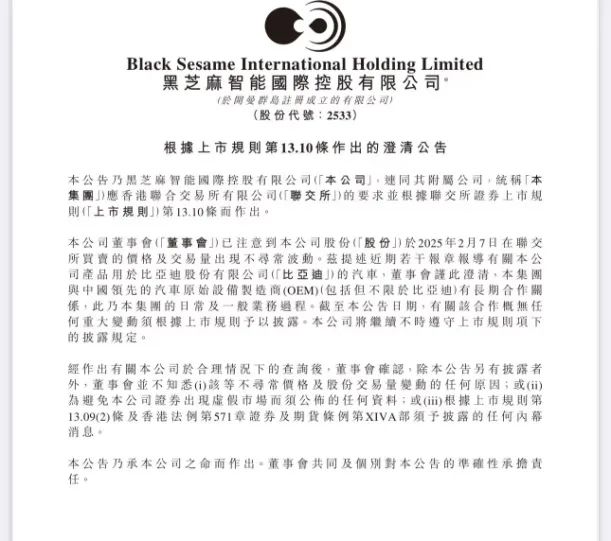 2月10日,黑芝麻智能发布公告,董事会已注意到公司股份于2025年2月7日在港交所买卖的价格及交易量出现不寻常波动。近期若干报道有关公司产品用于比亚迪股份有限公司的汽车,董事会谨此澄清,集团与中国领先的汽车原始设备制造商有长期合作关系,此乃集团的日常及一般业务过程。