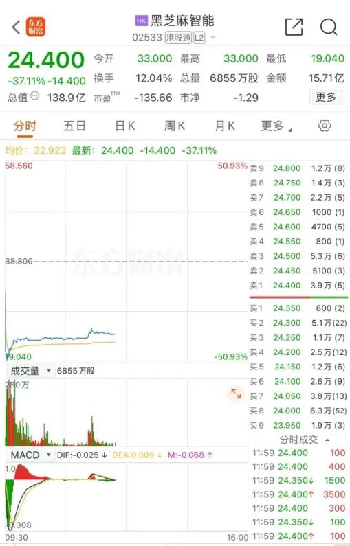 2月10日,港股黑芝麻智能开盘大跌,盘中一度闪崩近50%,截至午盘,黑芝麻智能跌37.11%,报24.4港元/股,总成交额为15.71亿港元,总市值报138.9亿港元。仅半天时间,黑芝麻智能总市值就跌去了约80亿港元。