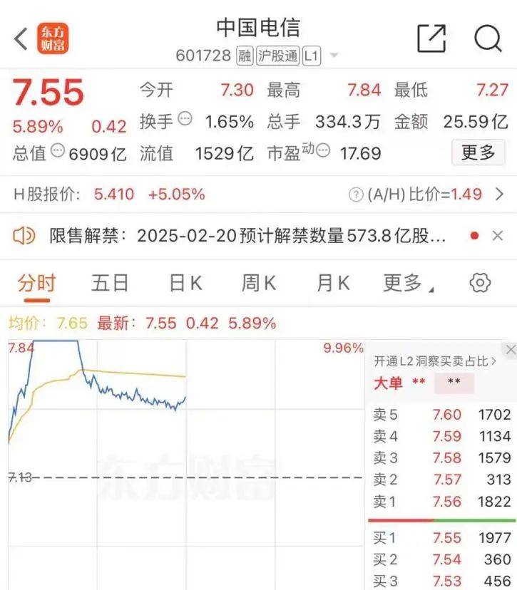 今日早盘,三大通信运营商大幅冲高回落,中国电信盘中一度涨停,股价创历史新高。截至午间收盘,中国电信涨幅缩窄至5.89%,中国联通涨超3%,中国移动涨超1%。