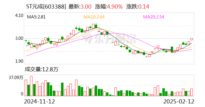 ST元成(维权)再度涨停,9个交易日内录得5个涨停,累计涨幅为25.00%,累计换手率为23.14%。截至10:38,该股今日成交量1127.11万股,成交金额3339.93万元,换手率3.46%。最新A股总市值达9.77亿元。
