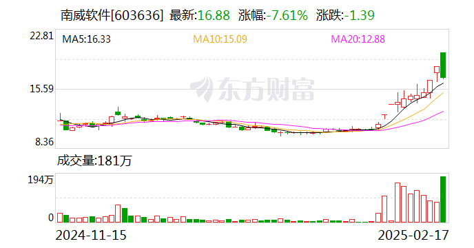 南威软件(603636)今日下跌7.61%,全天换手率31.17%,成交额33.71亿元,振幅19.48%。龙虎榜数据显示,沪股通净卖出2412.82万元,营业部席位合计净买入1342.04万元。