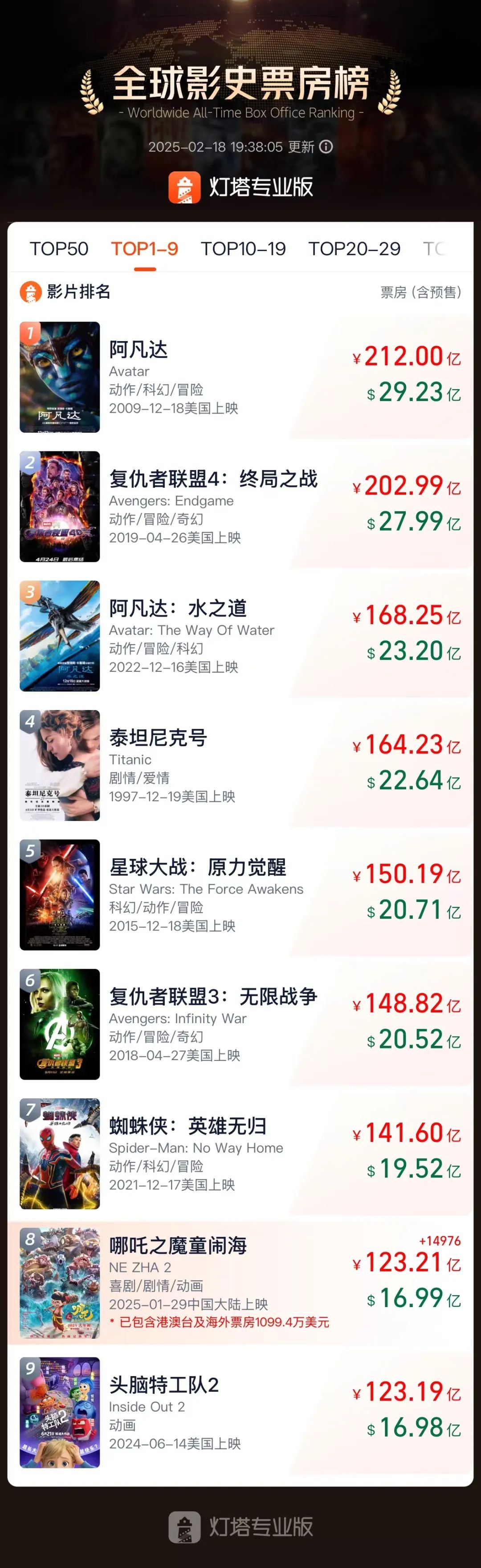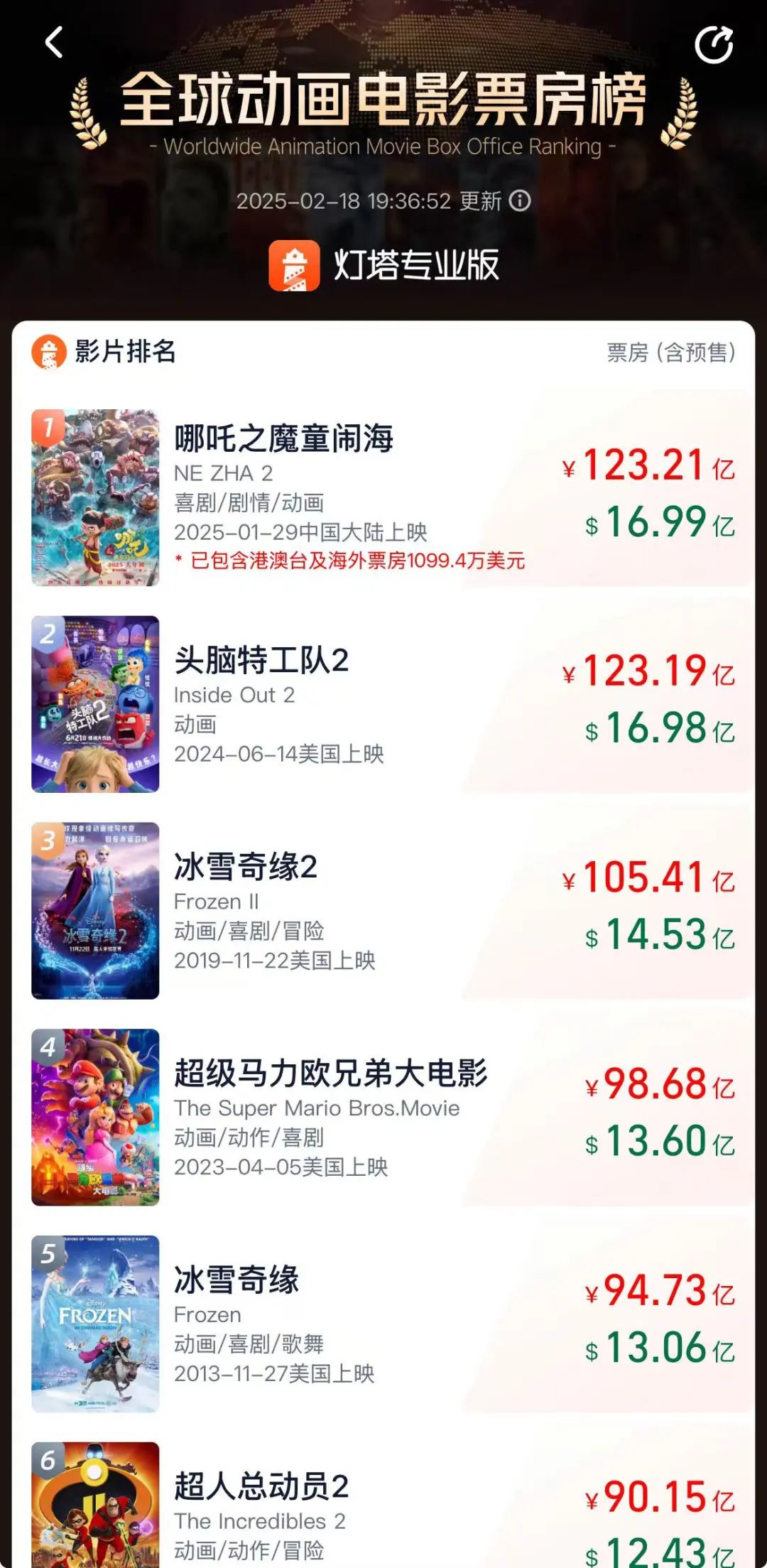 2月18日,电影《哪吒之魔童闹海》(或称《哪吒2》)实时票房超过《头脑特工队2》,登顶全球动画电影票房榜。
