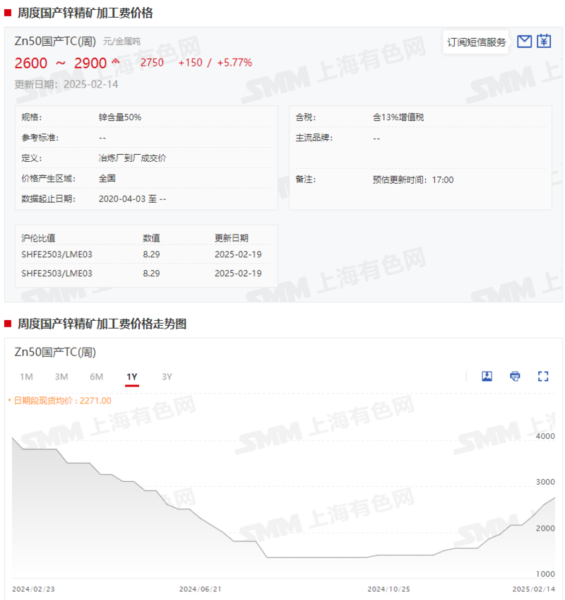 截至2025年2月14日,国产锌精矿周度加工费已经涨至2600~2900元/金属吨,均价报2750元/金属吨,较2024年的1450元/金属吨的历史低点上涨1300元/金属吨,涨幅达89.66%。