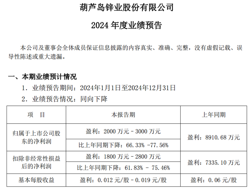 1月中下旬,锌业股份发布2024年业绩预告,其中提到,预计公司2024年归属于上市公司股东的净利润在2000~3000万元,相比去年同期下降66.33%~77.56%。