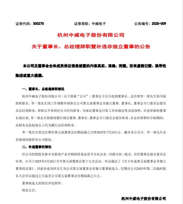 近日,杭州中威电子 股份有限公司(股票代码:300270,以下简称“中威电子”)的一系列变动引发了市场的广泛关注。2 月20 日晚间,公司发布公告,董事长、总经理李一策先生因工作调整辞去相关职务,在新董事长就任前,李一策先生仍需履行部分职责,而总经理职责暂由财务总监赵倩女士代理。回溯到 2024 年 3 月 18 日,公司也曾发布公告,总经理何珊珊因个人原因提交书面辞职报告,辞职后不再担任公司任何职务。除了频繁的高管变动,公司在 2025 年 1 月 22 日发布的《关于变更会计师事务所的公告》同样引人注目。