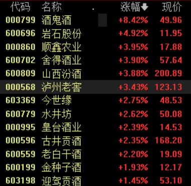 2月24日,白酒概念盘中大幅拉升,截至发稿,酒鬼酒涨超8%,岩石股份(维权)涨近5%,顺鑫农业、舍得酒业、山西汾酒等涨幅居前。