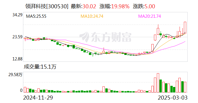 领湃科技今日涨停,全天换手率9.56%,成交额4.25亿元,振幅19.79%。龙虎榜数据显示,机构净买入1612.89万元,营业部席位合计净买入6190.76万元。