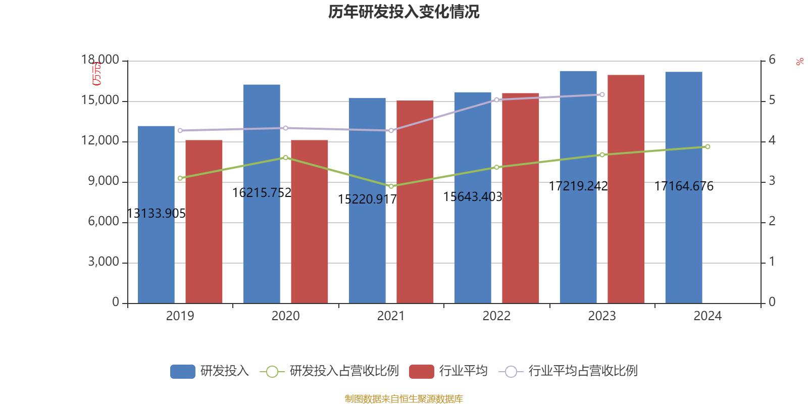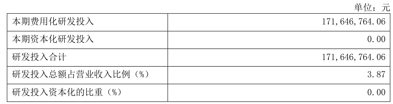 2024年全年,公司研发投入金额为1.72亿元,同比下降0.32%;研发投入占营业收入比例为3.87%,相比上年同期上升0.2个百分点。此外,公司全年研发投入资本化率为0%。