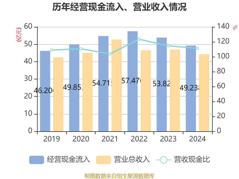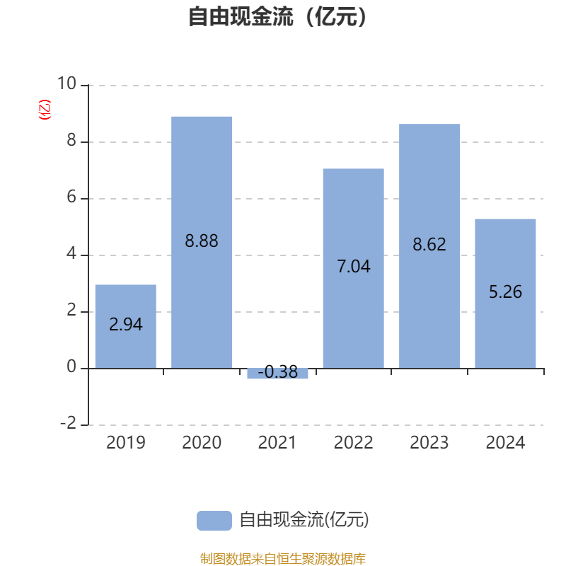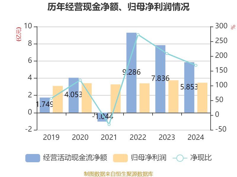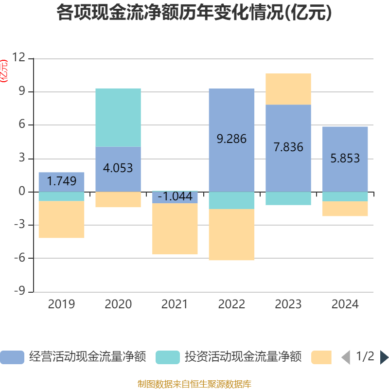 截至2024年,公司经营活动现金流净额为5.85亿元,同比下降25.31%;筹资活动现金流净额-1.33亿元,同比减少4.13亿元;投资活动现金流净额-8636.07万元,上年同期为-1.2亿元。